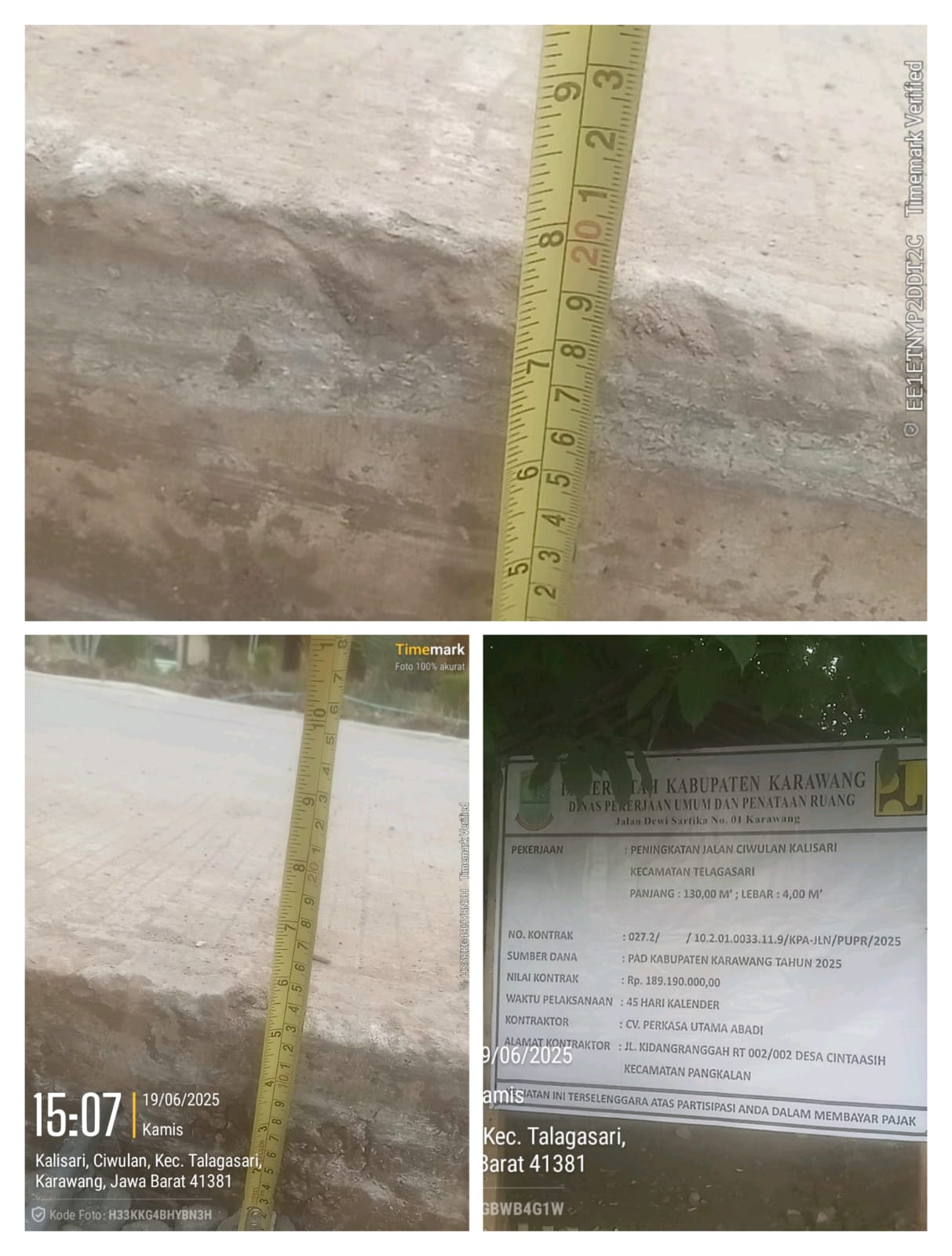 Proyek peningkatan jalan Ciwulan- Kalisari kecamatan telagasari Kabupaten Karawang Jawa barat di duga melenceng dari aturan, proyek peningkatan jalan dengan volume panjang 130 meter ,lebar 4 meter dengan waktu pelaksana 45 hari kalender yang di kerjakan oleh kontraktor menggunakan CV PERKASA UTAMA Kamis (19/6/2025)