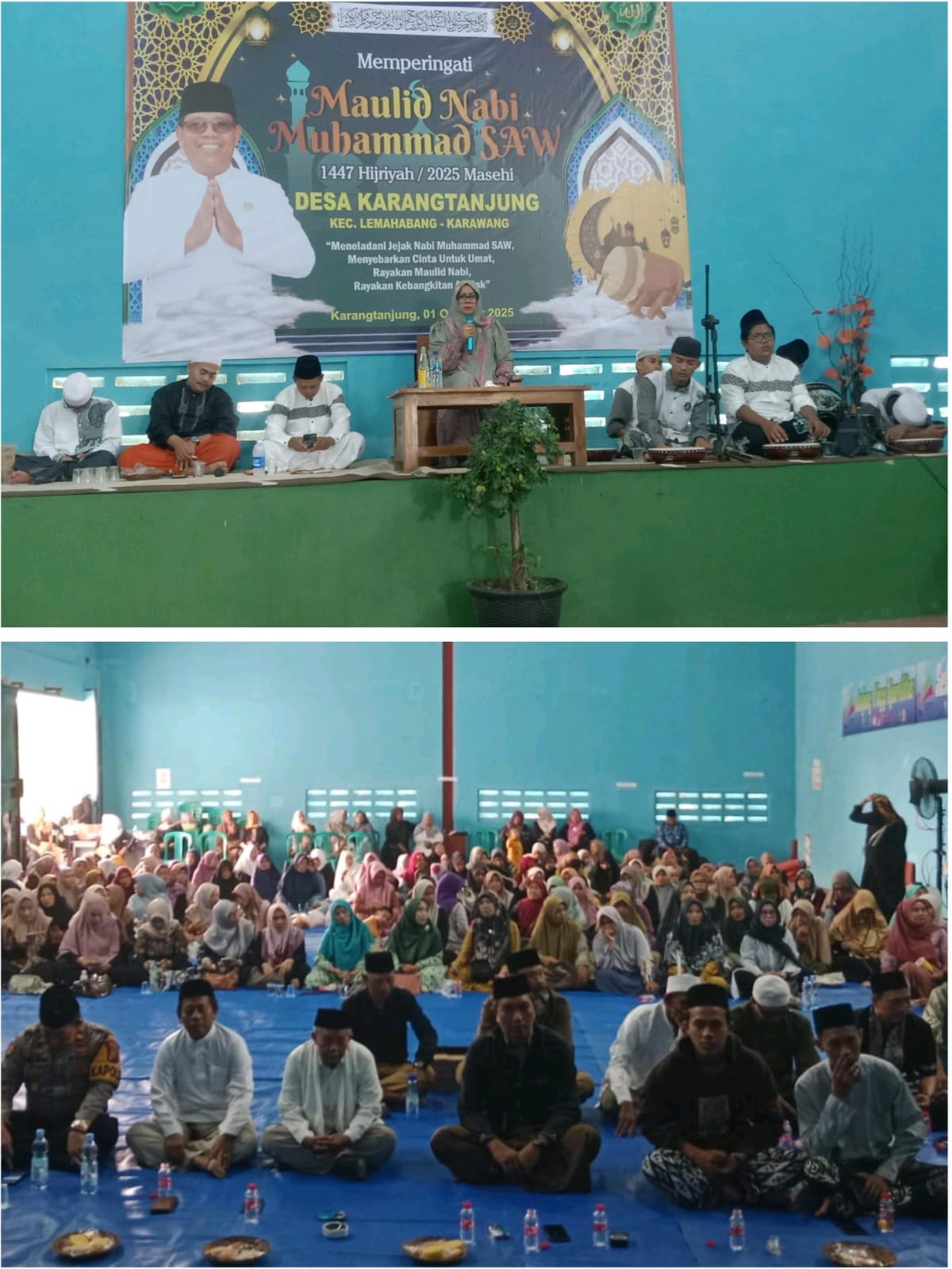 Meneladani jejak Nabi Muhammad Saw, menyebarkan cinta untuk umat, rayakan maulid nabi, rayakan kebangkitan ahlak”. itulah tema maulid nabi Muhammad SAW yang di gelar di GOR serba guna desa karangtanjung Kecamatan Lemahabang kabupaten Karawang Jawa Barat ,Rabu(01/10/2025)