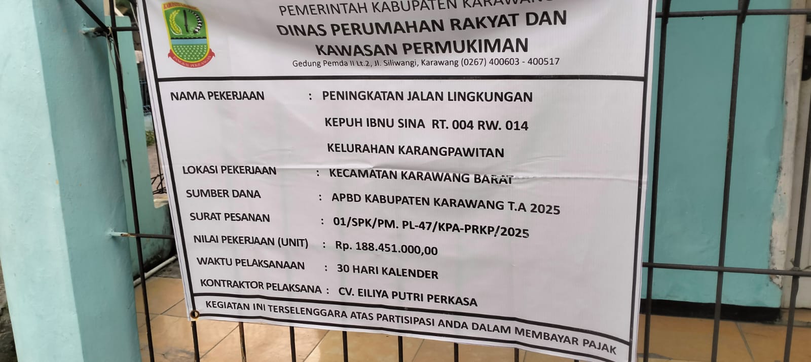 Proyek dengan nilai anggaran Rp188.451.000 tersebut tercatat dalam kontrak nomor 01/SPK/PM.PL-47/KPA-PRKP/2025, berada di bawah kendali Dinas Perumahan Rakyat dan Kawasan Permukiman (PRKP) Kabupaten Karawang, serta dilaksanakan oleh CV. EILIYA PUTRI PERKASA.